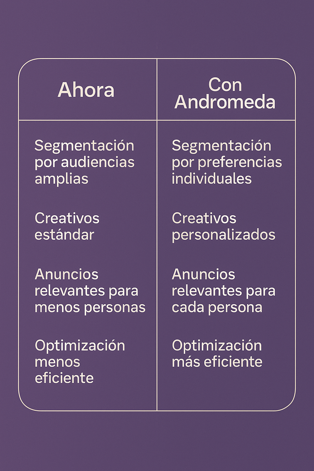 - Marca un nuevo piso de competitividad: quienes adapten primero tu campaña para beneficiarse de Andromeda estarán en ventaja frente a los que siguen usando estrategias antiguas.